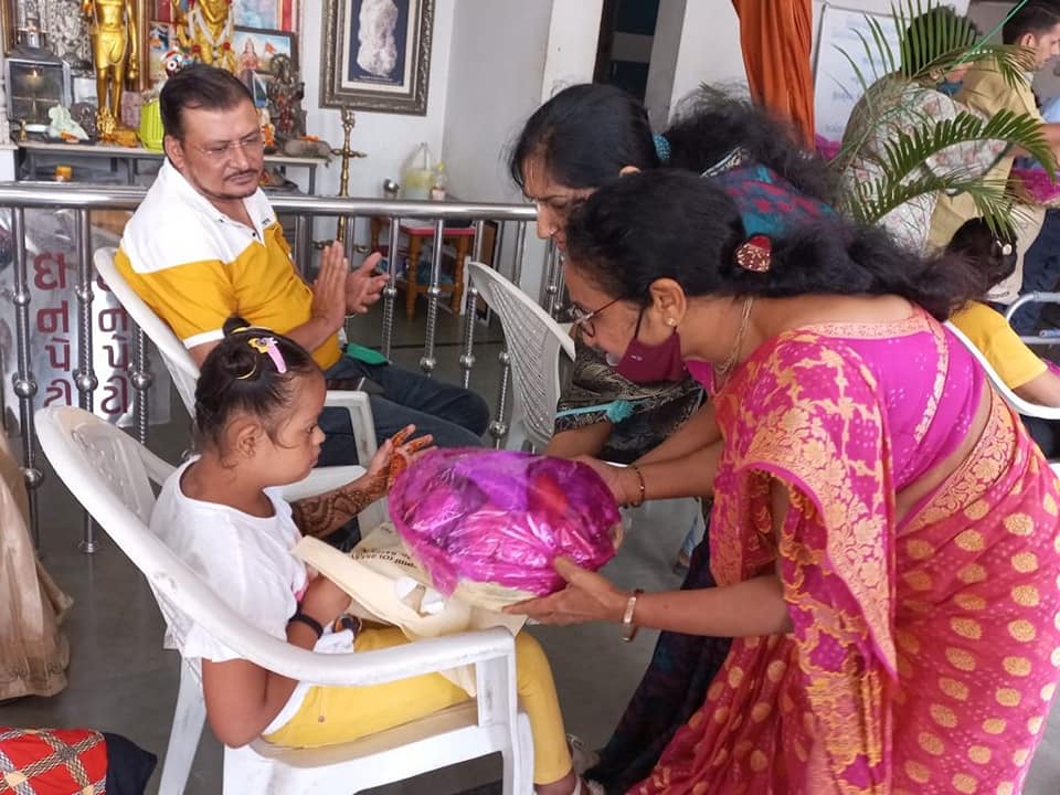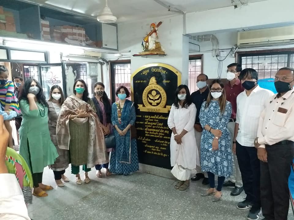 COVID HIGH SAFETY GADGET distribution with family(Mishka Renu) in Association with SGCCI & Dhruv Arvind Shah (Shahlon Silk industries Ltd) at Varacha Co Bank Ltd Branches.