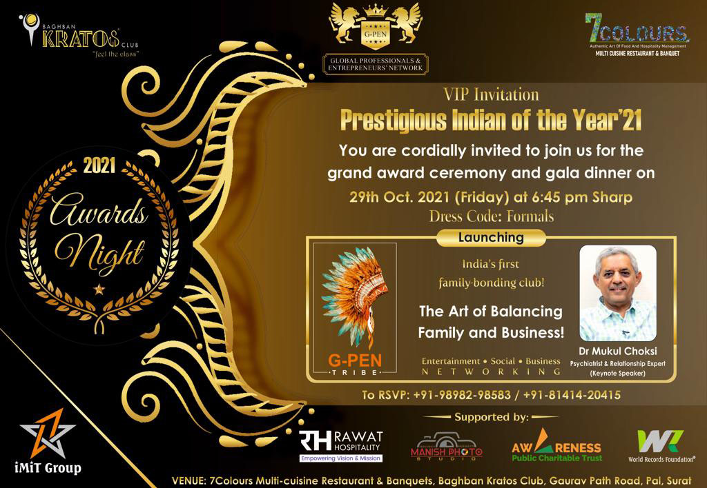 Here are a few pictures of G-PEN’s gleaming award show ‘Prestigious Indian of the Year 2021’ at 7Colours Banquets, Kratos Club, Pal wherein awardees and attendees from the United States of America, Hyderabad, Pune, Nagpur, Mumbai, Vadodara and Raipur remained present along with crème de la crème onlookers from Surat.